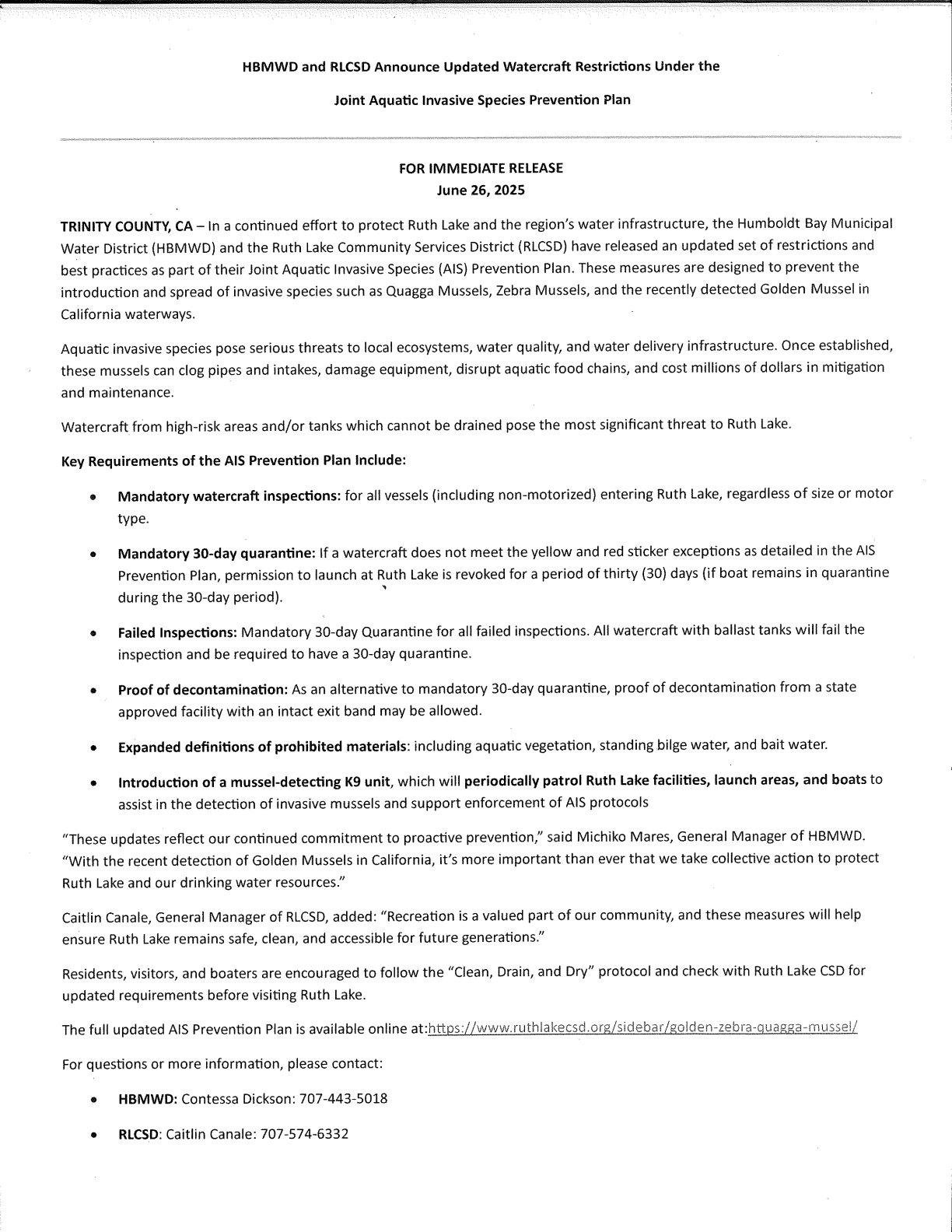 WATERCRAFT WITH BALLAST TANKS OR OTHER COMPONENTS THAT CANNOT BE DRAINED WILL AUTOMATICALLY FAIL AN INSPECTION. Boaters may obtain the MANDATORY 30-day RED quarantine band from Ruth Lake Marina or Ruth Rec Campground.